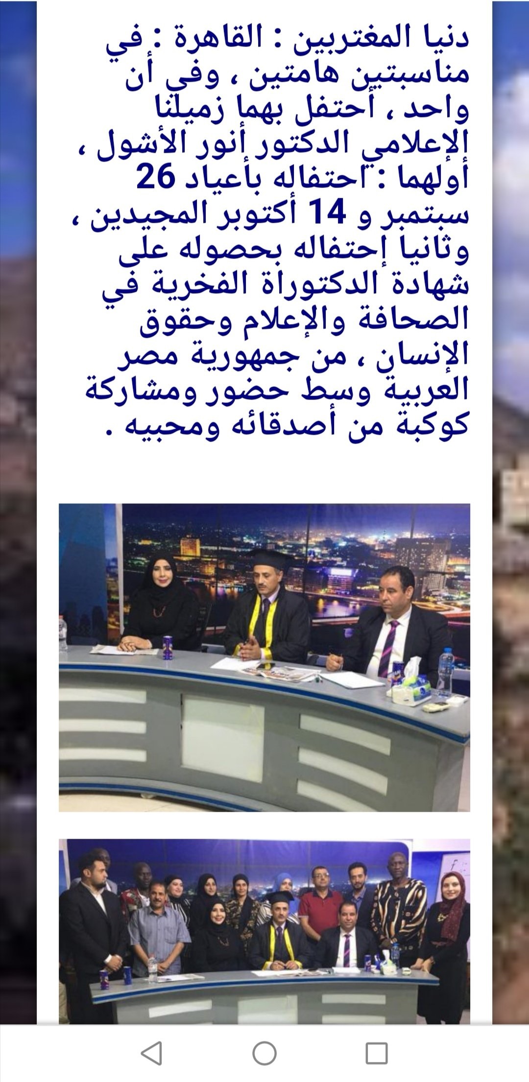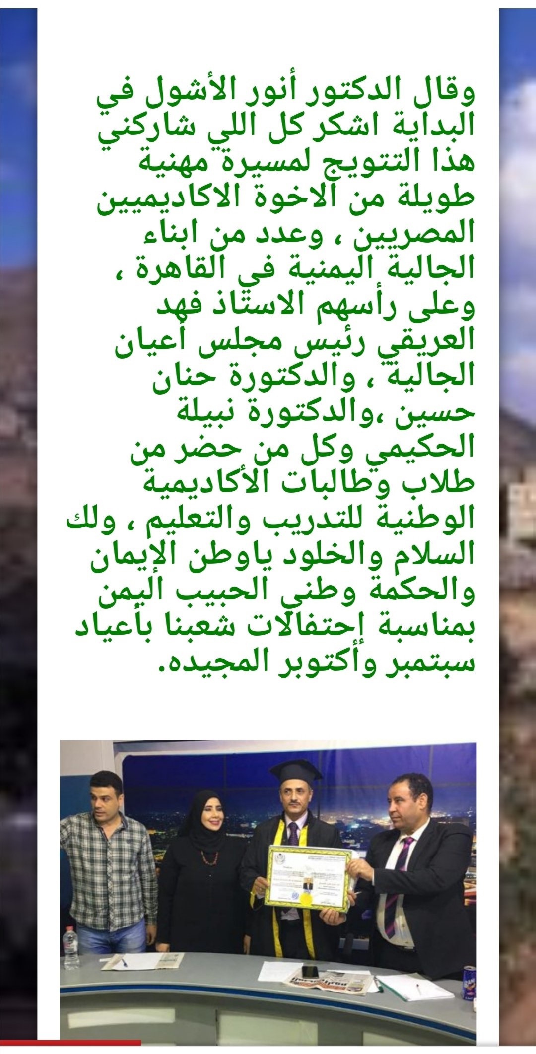 الشهادة الوهمية: دكتوراه في الصحافة والإعلام وحقوق الإنسان من الأكاديمية الوطنية للتدريب والتعليم والتنمية والإعلام..