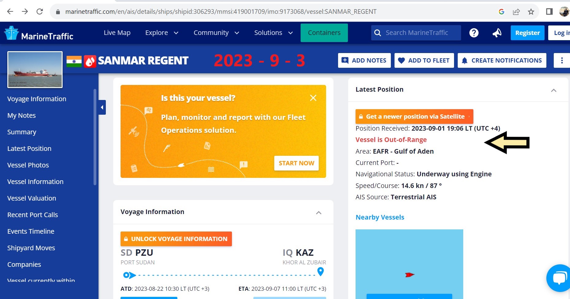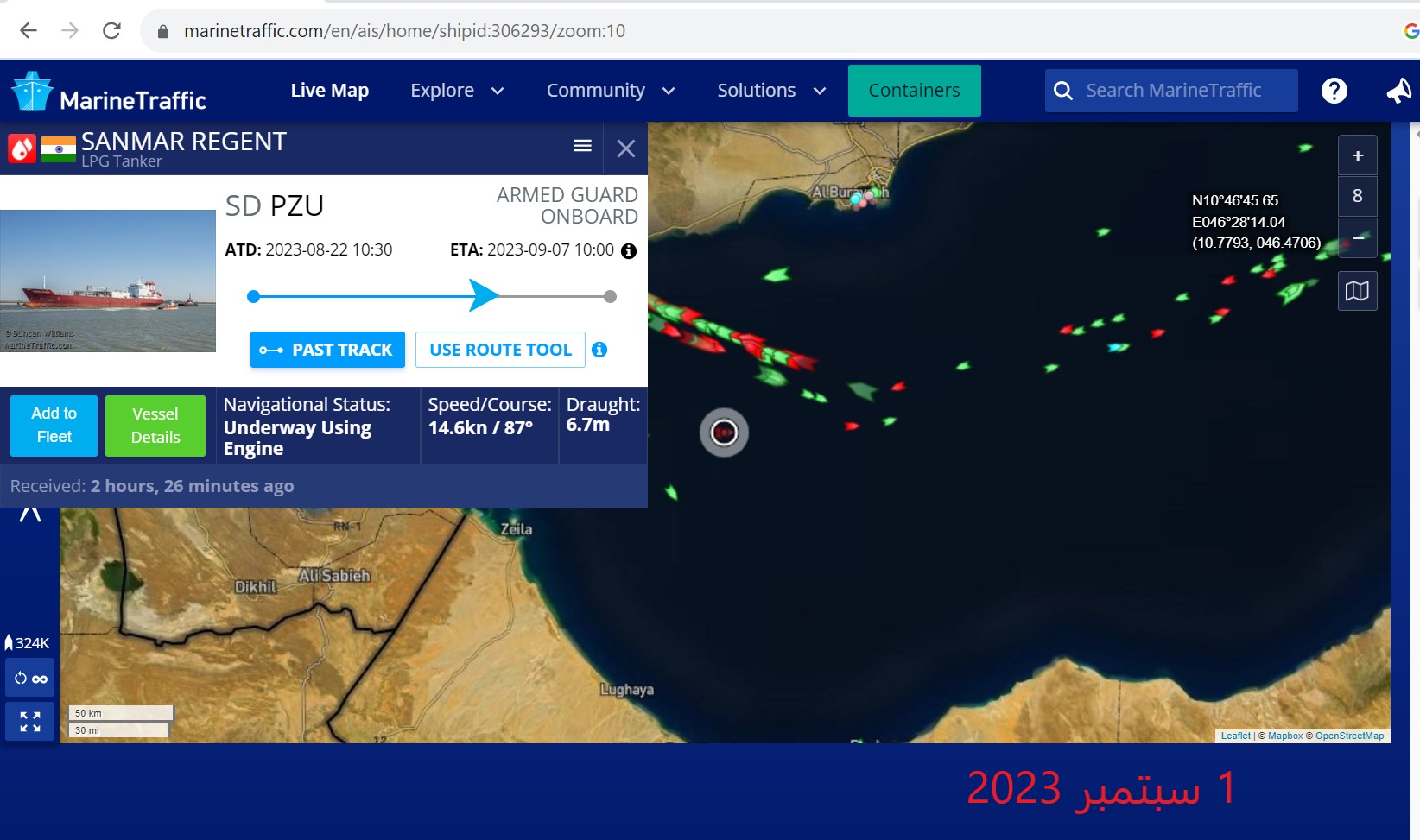 - ما زالت السفينة متوقفة في نفس الموقع منذ 2 سبتمبر 2023، وهو منطقة خط الملاحة الدولية بخليج عدن ومدخل مضيق باب المندب. اليوم 3 سبتمبر 2023 وبشكل مفاجئ تم إضافة الوجهة الجديدة للباخرة بانها متجهة الى خور الزبير بالعراق وتم تسجيل بانه غير متوفر موقعها الحالي وبقيت تظهر السفينة بنفس الموقع منطقة خط الملاحة الدولية بخليج عدن.